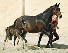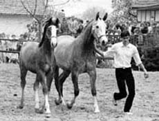 Schwalbenlied was the third mare Otto and Jutta Langels bought at Webelsgrund. She won the German National Riding Horse Championships in Hamburg and placed 2nd at the same event in Wiesbaden, ridden by Otto Langels himself. She also proved to be a great producer. Her brown son Santiago by Wie Ibikus was the NMS champion stallion in 1978 and became a major sire for the Bavarian Trakehner Stud Schwaighof and the Bavarian warmblood breed as well. Schwalbenlied's most important offspring however was her daughter, the elite mare Schwalbenburg. She produced 4 approved sons: the Danish champion dressage sire and "Trakehner Stallion of the Year 2003", Schwadroneur by EH Arogno, the Grand Prix dressage stallion Showmaster by Kostolany, the state stud stallion Sans Souci by Kostolany and the show jumper Stradivari by Upan la Jarthe AA, sire of the popular Key West and the 2001 champion K2. In addition, Schwalbenburg's daughter Burgschwalbe by Mozart produced the champion stallion Seigneur by EH Consul, who was sold to the US and did after only one breeding season, and Schwalenburg by Mozart, who is the foundation mare for the young approved Sarasani by EH Partout. Schwalbenburg's last direct daughter at the farm was the champion mare Schwalbenlust by Enrico Caruso, who very sadly passed away at the beginning of 2004. Her daughter Schwalbenspiel by Exclusiv now has the task to live up to the high standard her ancestors set. She started out well by producing the premium-mare Sankt Helena by Alter Fritz and the newly approved, premium stallion Shavalou by Freudenfest.
