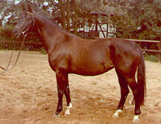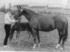 Thiara by Falke came from a family that was especially successful in the dressage ring. Her dam, the state premium mare Thila II by Condus was a full sister to the dressage stallions Temperitter and Tarim, both successful sires in North America. Their full sister Tekoa, the last of the siblings, is the dam of the young ATA approved Tzigane. The family carries the name S9A Sabine today, but really can be referred to as the Toga family. Only one mare represents this line at Haemelschenburg today, but she is like no other: the elite mare Thirza by Karon out of Thiara. She produced 12 foals in 12 breeding years and among several outstanding daughters, sired the 1996 reserve champion in NMS, Trocadero by Enrico Caruso, who today, stands at Sian Read's Bluewood Trakehner Stud in Great Britain.